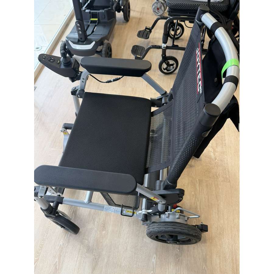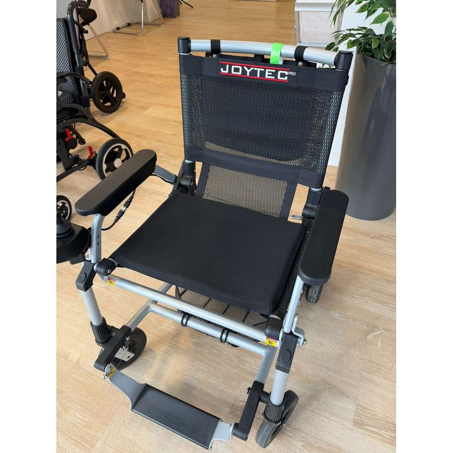 Silla de ruedas eléctrica Joytec Pro de color negro procedente de una de nuestras tiendas. Oportunidad única. Silla de exposición. viene con bolsa trasera, cesta inferior portaobjetos y cargador, usada muy poco. Cable magnético de separación de la silla en dos partes y ruedas macizas delanteras y traseras. Disponible para ver en nuestra tienda de Barcelona, c/Hercegovina, 13.